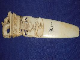 | Description / विवरण | Ivory knife with blunt edges, peacocks are carved on the body and in handle the tip is carved with elephant and the rider is missing. |