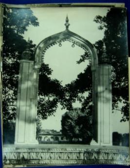 | Description / विवरण | Black and white photograph of the marble swing of Deeg fort. |