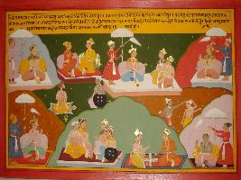 | Description / विवरण | Miniature painting based on Mahabharat - Bhishma parva depicting in Bharatkhand four Yugas accured. 1 Satyayuga-ruled by Devtas for 400 years 2 Treta yuga-continued for 3000 years. 3 Dwaparyuga-continued for 2000 years, 4 Keliyagu-1000 years, but in Kaliyuga nobody can say how many years a human survices. But in Satyayuga people are rich and had long ages. |