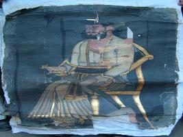 | Description / विवरण | It is a painting, dealing with a king shown seated on a chair holding sword having golden hilt with well elaborate moustaches and beard. |