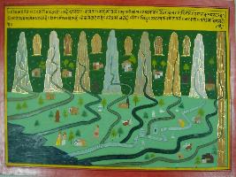 | Description / विवरण | Miniature painting based on Mahabharat - Bhishma parva depicting that there are seven mountains called Mahendra Parvat, Malay Parvat, Sahajpachal Parvat, Vindhyachal, Parijat, Bankupare Parvat. In the middle of all mountains there are many mountains and many cities. There is Ganga, Sindhu, Saraswati, Godavari, Narmad also. |