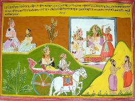 | Description / विवरण | Miniature painting based on Harivansha depicting a child is talking to king, in left top king is talking with two ministers a chauri bearer behind. A king shown on rath and in left below, two sages are shown talking to each other. |