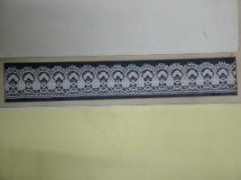 | Description / विवरण | Nottingham machine lace Dentella Mattese . It is a machine made cotton thread lace designed with half diamond shaped and floral designs are also used on it. The upper margin border line is designed with chain and zigzag pattern. |