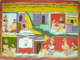 | Description / विवरण | Miniature painting based on Harivansha depicting Raja sitting with his son individually and talking to him at upper left upper right and lower right panel. At the lower left panel Raja is talking to all four of his sons. at the middle portion of painting his palace is depicted. |