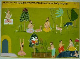 | Description / विवरण | Miniature painting based on Raghuvansha depicting a king asking a sage if he feels any problems in meditation. Whether they get disturbed by lust and desire. |