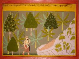 | Description / विवरण | Miniature painting based on Mahabharat - Vana parva depicting Bhim asking old Hanuman to remove his tail and give him way. Hanuman replied that he is old and asked him to remove his tail and pass away. |