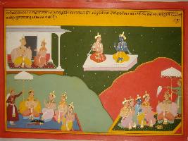 | Description / विवरण | Miniature painting based on Mahabharat - Bhishma parva depicting Dhritrashtra telling Sanjay that Pandavas become greedy for wealth and state so they are fighting then Sanjay is countering his answerand says that not the Pandavas but Duryodhan is greedy for wealth and state. |