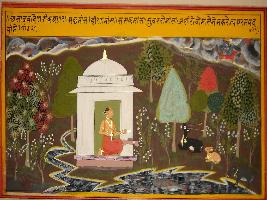 | Description / विवरण | Miniature painting based on Ekadashi Mahatmya depicting Ekadashi worship in Asad month depicting then if some one do not eat Fish, Deer, Rabbit and pig, can get moksha and heaven. |
