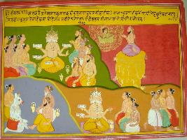 | Description / विवरण | Miniature painting based on Harivansha depicting Brahma and nine Sanat Kumars, they achieve boon from Brahma by doing penance. |