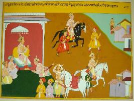 | Description / विवरण | Miniature painting based on Raghuvansha depicting a king seated on throne and a soldier is paying homage by bending down. Some soldiers are seated on the horses. |