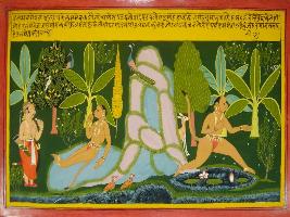 | Description / विवरण | Miniature painting based on Mahabharat - Vana parva. On the painting Bhim asked to Hanuman to leave the way and Hanuman replied that he cannot do so due to his tiredness and asked Bhim to go on from his body. |