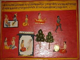 | Description / विवरण | Miniature painting based on Ekadashi Mahatmya depicting the Ekadashi vrat of Asad month. On the painting king Yudhisthir is talking with Krishna and other sides the features of Ekadashi of this particular month are seen. |