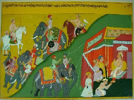 | Description / विवरण | Miniature painting based on Raghuvansha depicting Kamrupeshwar, who has come to meet king Raghu by bringing gifts. In the left side, the king is sitting in a tent. |