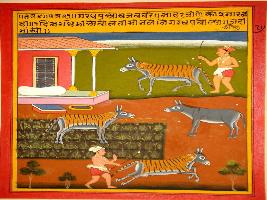 | Description / विवरण | Miniature painting based on Panchtantra depicting a donkey standing and scheming at middle left portion, he putting a lion skin so that nobody recognise him and went to one field then a farmer chased the donkey away and brought it back to his house. |