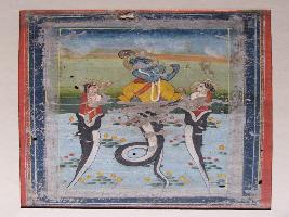 | Description / विवरण | It is a painting of Naaglila, in which dancing Krishna is shown, standing on the male Naag, flying flute, while Naag-kanya is shown in either side in river. |