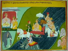 | Description / विवरण | Miniature painting based on Raghuvansha depicting a king coming down from Himachal mountain via river and kings of other countries have started shivering out of fear. |
