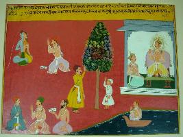 | Description / विवरण | Miniature painting based on Raghuvansha. On the upper side Ardhanarishwara is depicted and a man worshipping. A king is seated on a throne and talking to a man. On the lower part three men are depicted talking. |