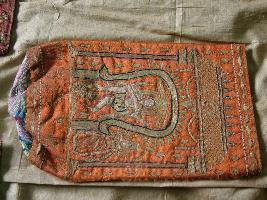 | Description / विवरण | It is a bag to carry the sacred ashes with silk embroidery and gold thread work. Subjectively Hindu mythological figure of gods and goddess in their shrines under the shade of architectural figure is present on it. |