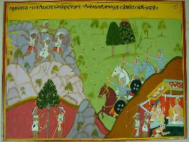 | Description / विवरण | Miniature painting based on Raghuvansha depicting camp of a king. Outside the camp, fight between the army of king and tribes is depicted. |