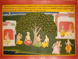 | Description / विवरण | Miniature painting based on Mahabharat - Bhishma parva depicting east of Meru Parvata there is Kalamra garden where there is a tree called Kalamra exists which has fruits Some Sidhapurus praying daily to this tree and dancers are dancing near them. Kala bhawnra eat this fruits and be younger forever. |