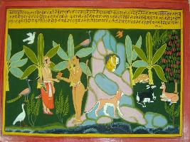 | Description / विवरण | Miniature painting based on Mahabharat - Vana parva depicting Hanuman s massive form and Bhim getting frightened and praying Hanuman to give his identity. |