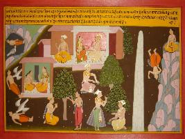 | Description / विवरण | Miniature painting based on Mahabharat - Bhishma parva depicting on the North of Meru, Uttarkurukhand situated. Its beauty is known and here in all 12 months one can eat sweet fruits. From this fruits milk, ganas, cloths, all earth, wealth created. In this khand God, has taken his 8 avataras and here Bharand bird lives who has taken the human being in caves. |