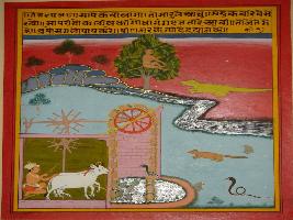 | Description / विवरण | Miniature painting based on Panchtantra depicting the story of the monkey and the crocodile. At the lower part the story of Gangadat is depicted who ask mercy from the snake whom they planned to kill. |