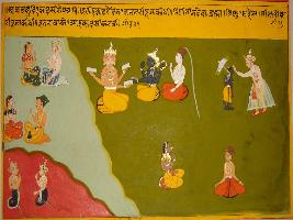 | Description / विवरण | Miniature painting based on Ekadashi Mahatmya depicting the importance of Ekadashi vrat of the month Asad. Here in the painting, it is depicted that by performing Asad month s Ekadashi anyone get the same blessing as the worship of Brahma Vishnu and Mahesh. |
