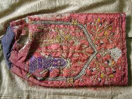 | Description / विवरण | It is a bag to carry the sacred ashes, silk embroidery and gold thread work. Subjectively Hindu mythological figures of gods and goddess in their shrines under the shade of tree in several colours on a dark red ground is present. |