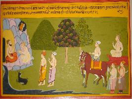 | Description / विवरण | Miniature painting based on Ekadashi Mahatmya depicting Ekadashi of Migsar month depicting a Brahman telling king that a sage lives in the hermitage on this mountain and he will tell them about Ekadashi. Then they reach to the hermitage of the sage and ask him about the Ekadashi vrat. |