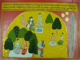 | Description / विवरण | Miniature painting based on Mahabharat - Bhishma parva depicting Kuvera residing on Meru Parvat with other demons. It aslo depicts in Karnyakavana Shiv recides with Parvati gurded by Nandi and Bhingi. |