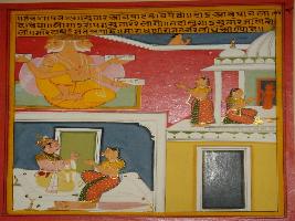 | Description / विवरण | Miniature painting based on Panchtantra depicting Sutar come back from the village and hide under the bed. When the feet of his wife touches him she attentively said another man not to touch her as Brahma has touched her. |