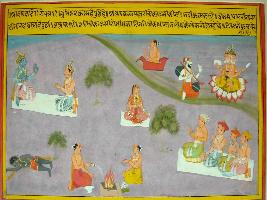 | Description / विवरण | Miniature painting based on Ekadashi Mahatmya depicting Ekadashi of Shravan month depicting Yudhisthir asking Krishna about Ekadashi of Shravan month. Then Krishna tells him about importance of the vrat. He told him that name of this Ekadashi is Kamini and it will be fruitful to worship on that day. |