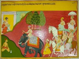 | Description / विवरण | Miniature painting based on Raghuvansha depicting the procession of a king with his army. A sage is seated on extreme right of the painting. |