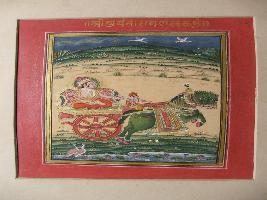 | Description / विवरण | It is a painting, in which Surya Narayana is shown on a chariot while the carrier and seven horses are painted in front of him. River in foreground and mountain in background. |