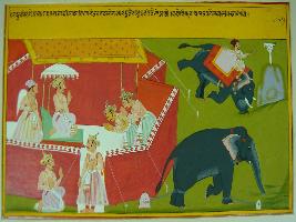 | Description / विवरण | Miniature painting based on Raghuvansha depicting a scene of a tent in which king is seated under canopy and courtiers paying courtesy to him. Two elephants shown outside the tent, in which an elephant is marching towards a rock. |