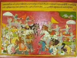 | Description / विवरण | Miniature painting based on Mahabharat - Shalya parva depicting Ganhara s prince coming with 10000 army to support Kauravas and vigorous war between Kaurvas and Pandavas. |