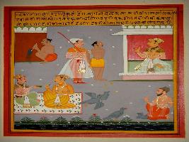 | Description / विवरण | Miniature painting based on Panchtantra depicting a thief caught during his work and brought to king for punishment. In lower part two nobles are depicted sitting and talking to each other, besides them a yogi is sitting and talking to birds and rats. |