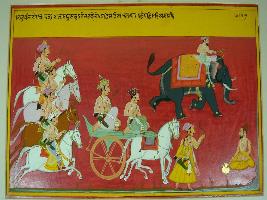 | Description / विवरण | Miniature painting based on Raghuvansha depicting a scene of campaign, in which king Raghu seated on Chariot and followed by horsemen. A mahavat seated on elephant on left upper part. A rishi is seated in their way in the corner of left below. |