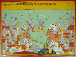 | Description / विवरण | Miniature painting based on Mahabharat - Shalya parva depicting heavy war between armies of Pandavas and Kaurava. |