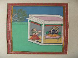 | Description / विवरण | It is a painting of Krishna, shown within a fortified area, sited on a platform with a green pillow. An attendant or worshiper is shown in front of him. Turquoise background. |