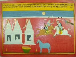 | Description / विवरण | Miniature painting based on Mahabharat - Bhishma parva depicting that VedaVyas is saying that when Kauravas and Pandavas will fight everything will disturbed. The sculpture of Deva is in fear and laughing. |