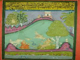| Description / विवरण | Miniature painting based on Ragmala depicting Ragini Ashwari depicting Ragini Ashwari who is the queen of intelligence and idleness is sitting under a tree and watching a charmer. |
