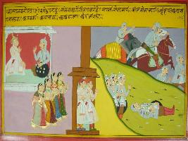 | Description / विवरण | Miniature painting based on Mahabharat - Shalya parva depicting Dhritrashtra regreting against Sanjay, saying that all the army died, whole army is destroyed and only 3 persons are left alive viz. Kritvarma, Kripacharya and Ashwathama. |