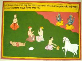 | Description / विवरण | Miniature painting based on Ekadashi Mahatmya depicting Ekadashi of Migsar month depicting that if one shouldn t get moksha then by listening the katha of Ekadashi vrat and by doing it, he will get the result of yagna. |
