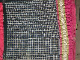 | Description / विवरण | It is a breast cloth in a rectangular shape. The upper portion is in black and cream check and the bottom is in a thin red border with cream small border with floral designs. This piece is made in Surat. |