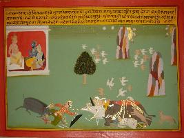 | Description / विवरण | Miniature painting based on Mahabharat - Bhishma parva depicting that Vyas is the one who can depict the result of the war between two armies depicting that king Dhrithrashtra is talking to everyone about armies. The kaurava army is about to move up he is regreting by saying that only he alive to see this war in between brothers. Then Vyas says that if dead bodies are kept on Panchagani mountain then they will get heaven. |