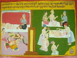 | Description / विवरण | Miniature painting based on Mahabharat - Shalya parva depicting Dhritrashtra fainting and falling on the ground by hearing words of Sanjay. Later Vidur and other females in palace also got fainted. Dhritrashtra wakes up and breathes like snake s hiss. |