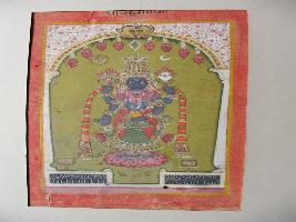 | Description / विवरण | It is a painting in which Balaji or Vishnu the four armed god is shown with his attributes conch and chakra in varada posture within an arched roof. |