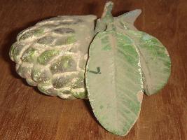 | Description / विवरण | Custard apple with stem and three leaves, made of clay, in green colour. |